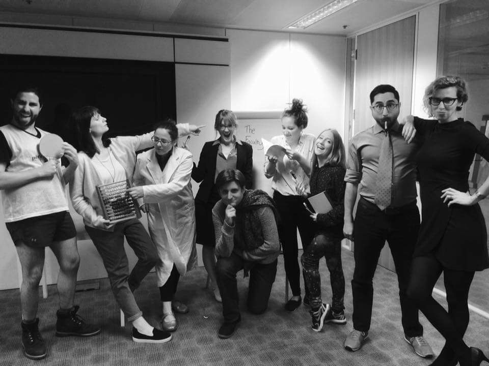 It’s a fun way to end a workshop as it uses lots of different improv skills in one game. It’s also good for teaching character, relationship, escalating, reincorporation, listening and making connections.