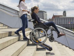 We first looked into a full lift, but it wasn’t structurally possible to build one. We then looked at a stair lift (rails attached to the side of the wall) but the stair corner was too tight and it didn’t fit. So the stair climber became the best solution as they are used in smaller venues that can’t have full lifts.